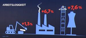 Heute wieder einmal in der Zeit im Bild 1 des ORF: die Arbeitslosigkeit steigt. Seit 31 Monaten tut sie das. 388.118 Menschen sind ohne Job gemeldet, das sind ca. 4,4% mehr als im Vorjahr. Die Arbeitslosenquote ist um 7,2% gestiegen; im Handel sogar um 7,6%, in der Industrie um 6,7%, am Bau sieht es mit +1,7% noch relativ gut aus: