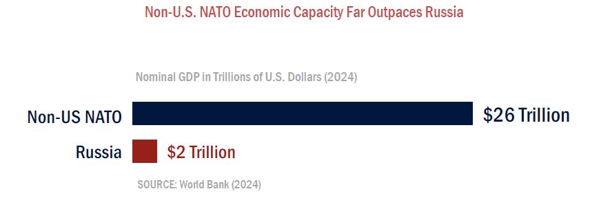 Im dritten Punkt geht es dann um Russland und darum, dass die Unterstützung der NATO-Partner in Europa „begrenzter“ werde. Russland wird als „a persistent but manageable threat“ dargestellt, also eine dauernde aber „verwaltbare“ Bedrohung, eigentlich aber als Aufgabe der Europäer: „European NATO dwarfs [übertrifft] Russia in economic scale, population, and, thus, latent military power.“ Dazu gibt es auch eine kleine Grafik auf Seite 11 (bzw. 19):