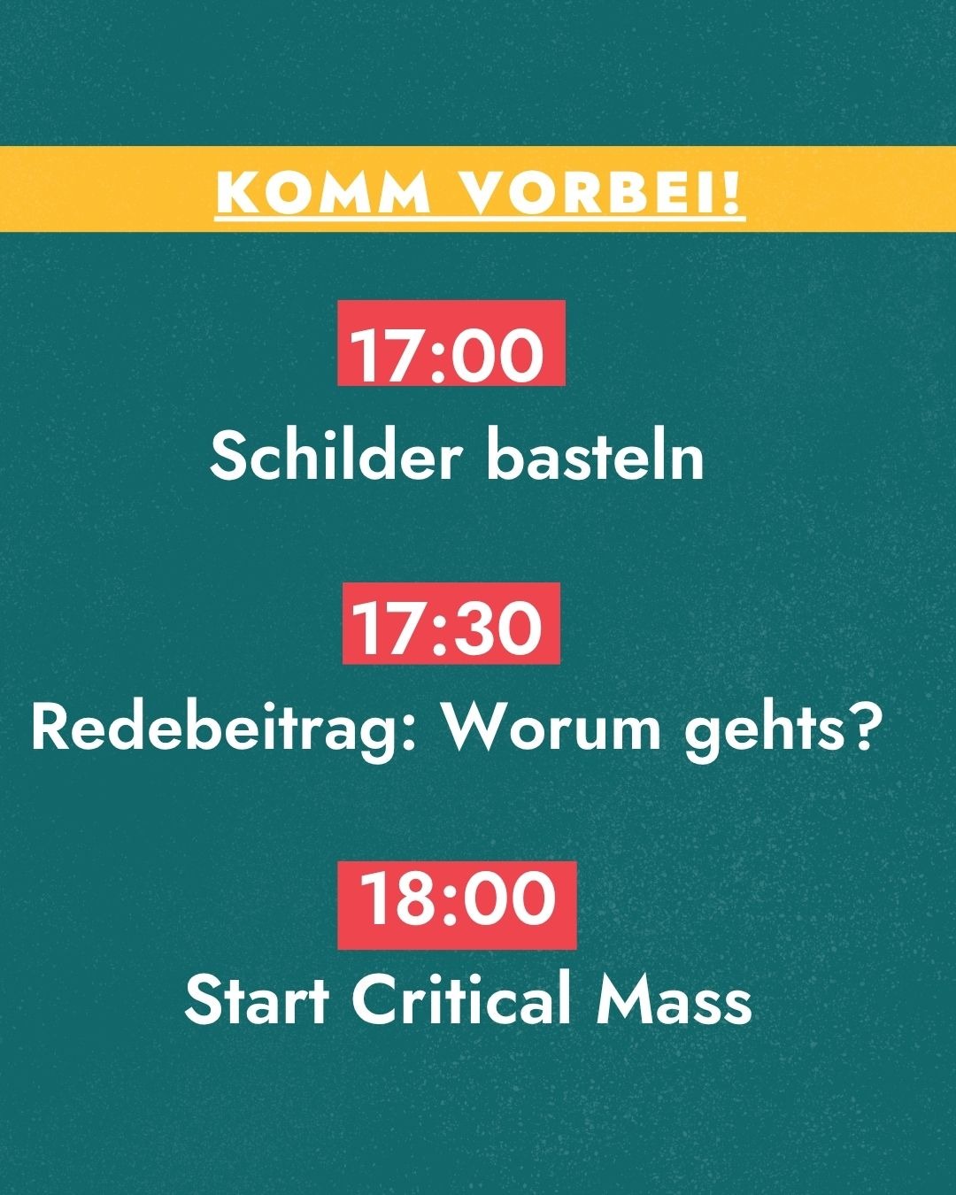 Kommt am Freitag, den 24.04. um 17.00 Uhr an die Annasäule. Bringt Eure Fahrräder und Friends mit – nach der Kundgebung erobern wir gemeinsam mit Critical Mass die Straßen!