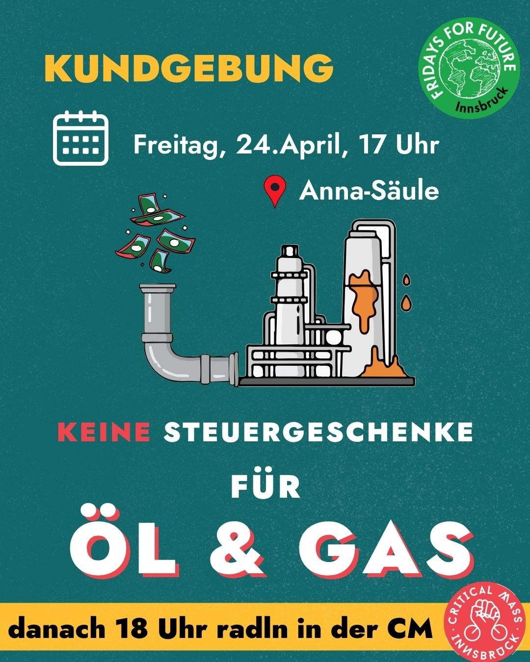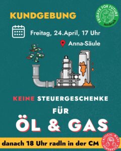 Die For Future Allianzen (Fridays, Scientists, Teachers, Parents, Health … for Future) und Critical Mass rufen für Fr 24.4. ab 17 Uhr zu einer Kundgebung mit anschließender Fahrraddemo gegen falsche Investitionen in fossile Abhängigkeit auf: